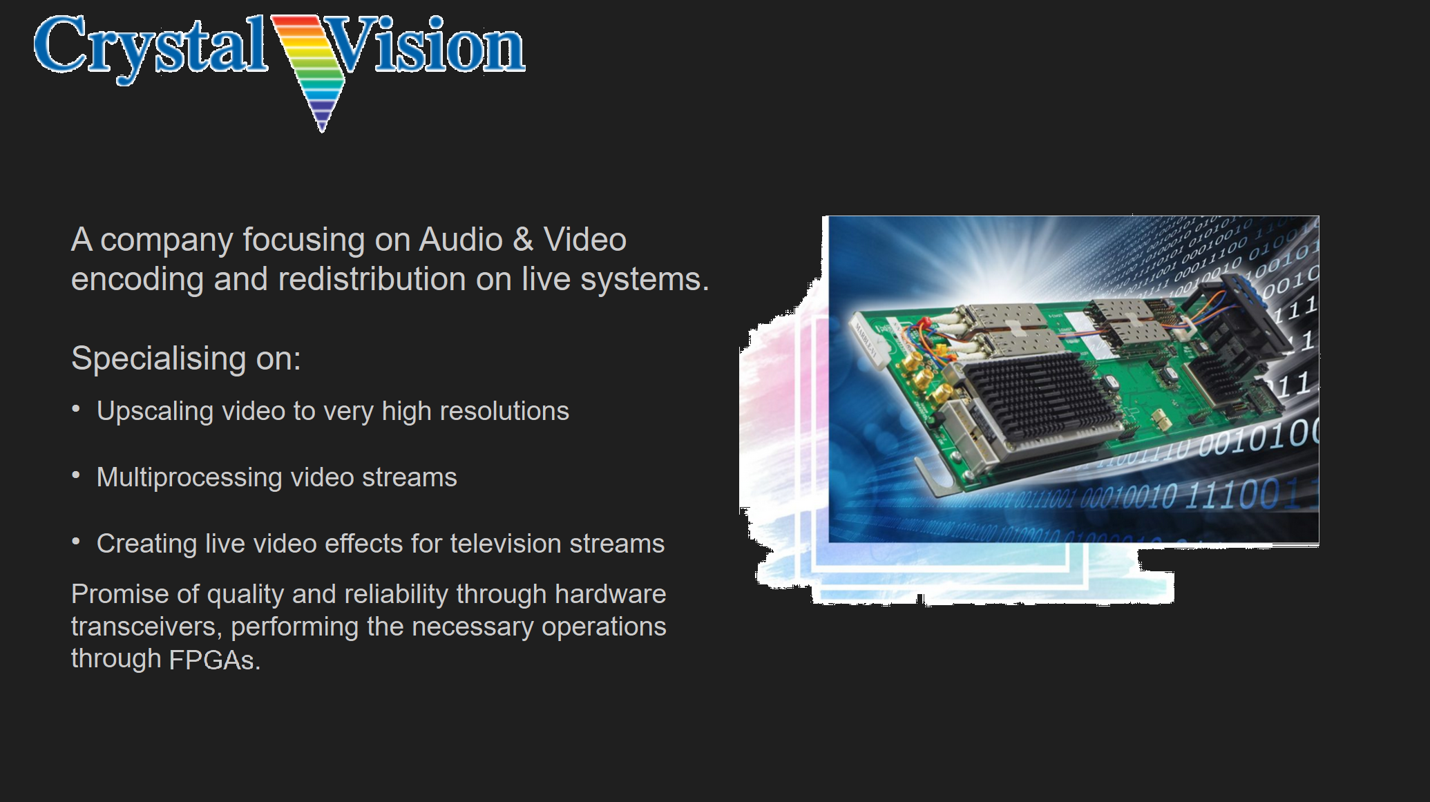 Crystal Vision made infrastructure and keying products for professional broadcast engineers in the television industry. It helped people transition through a range of technologies, from SD to HD and from HD to IP. Part of their products included FPGA transceivers for high-speed parallel video streaming solutions.