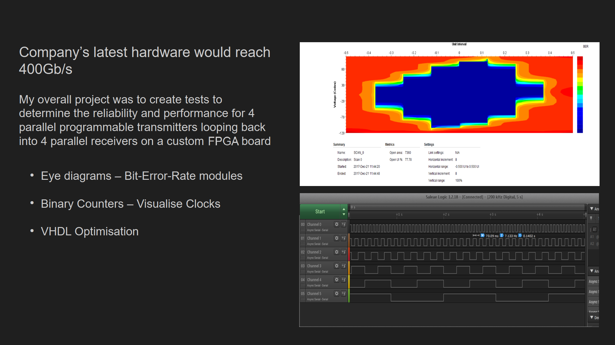 I had the chance to work on high-speed signal analysis software, which helped me train in quickly developing skills with new unfamiliar technologies.