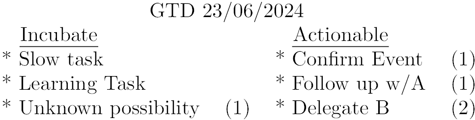 Anything under Actionable is a task that needs Defering, Delegation or to be completed. Attempts at writing tasks down should try and maintain the same topic as much as possible. After all, when focusing on a project, it’s easy to think of all the tasks. It’s much harder to jump around various tasks and write them all down. This can fail as things come up, and as the section grows over the day, but it’s good enough.