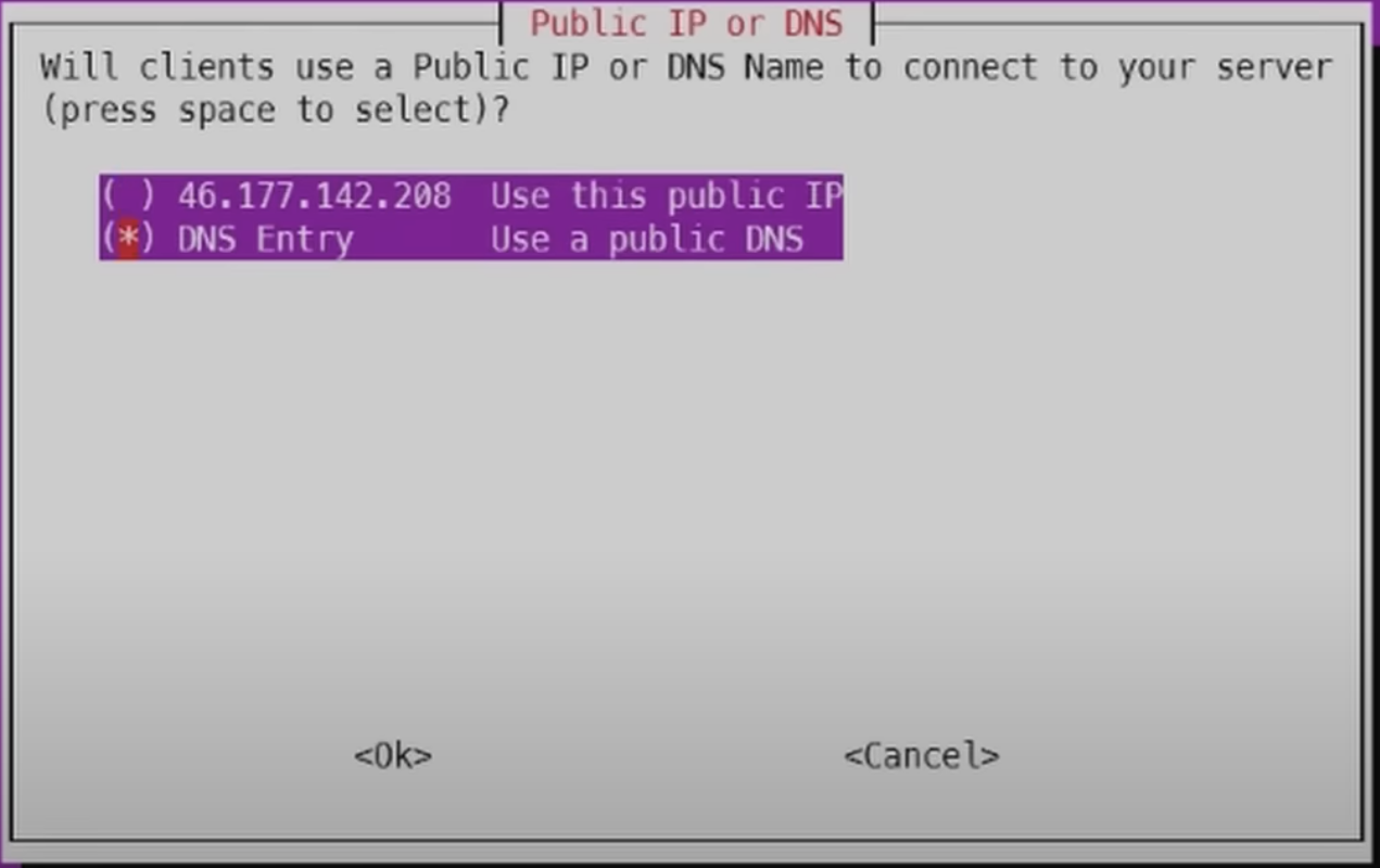 At this stage the port used for WireGuard was selected, default being 51820. Then there’s a choice of public DNS provider, which is arbitrary for the PI. The following page configures how the connection to the server, and they had to be changed to “DNS Entry”:
